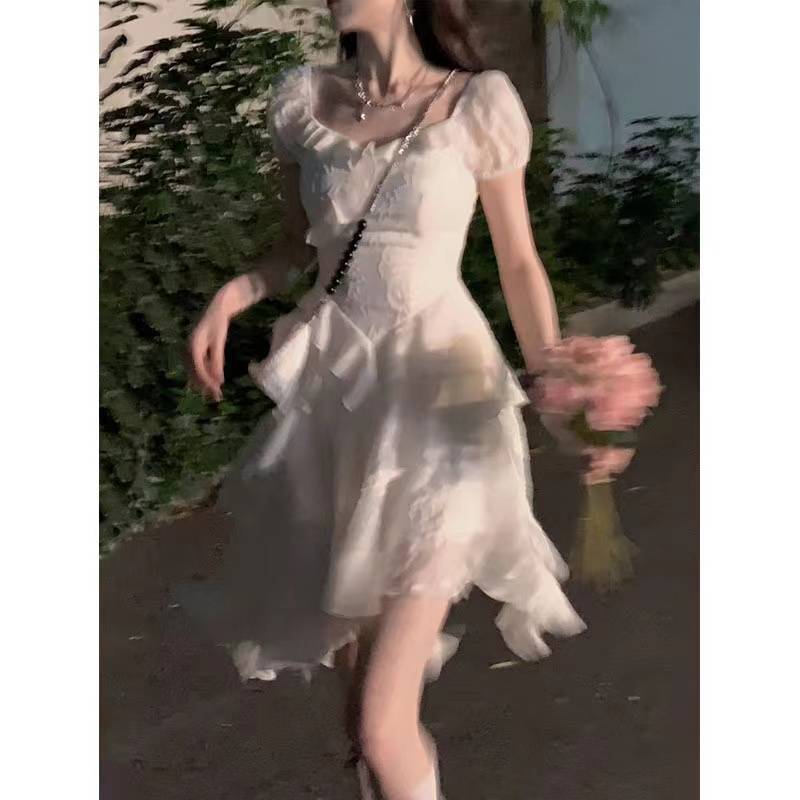 XXSZL2023白色法式茶歇连衣裙女夏季新款荷叶边不规则短裙子
