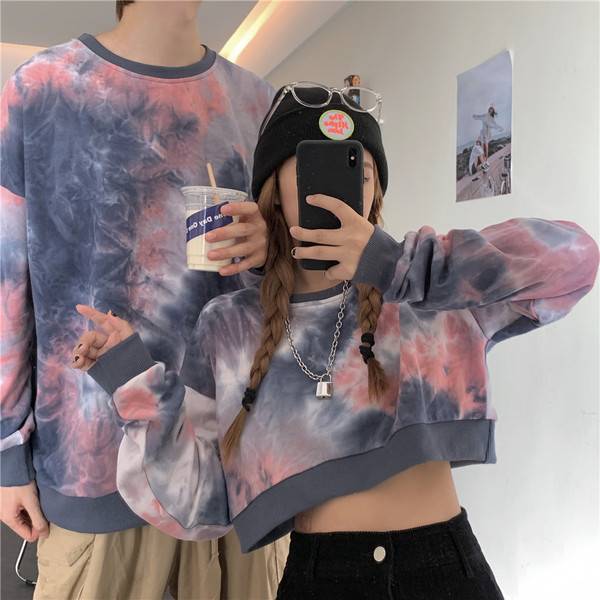 2020秋季韩版原宿风扎染长袖上衣宽松短款圆领套头卫衣女情侣装潮