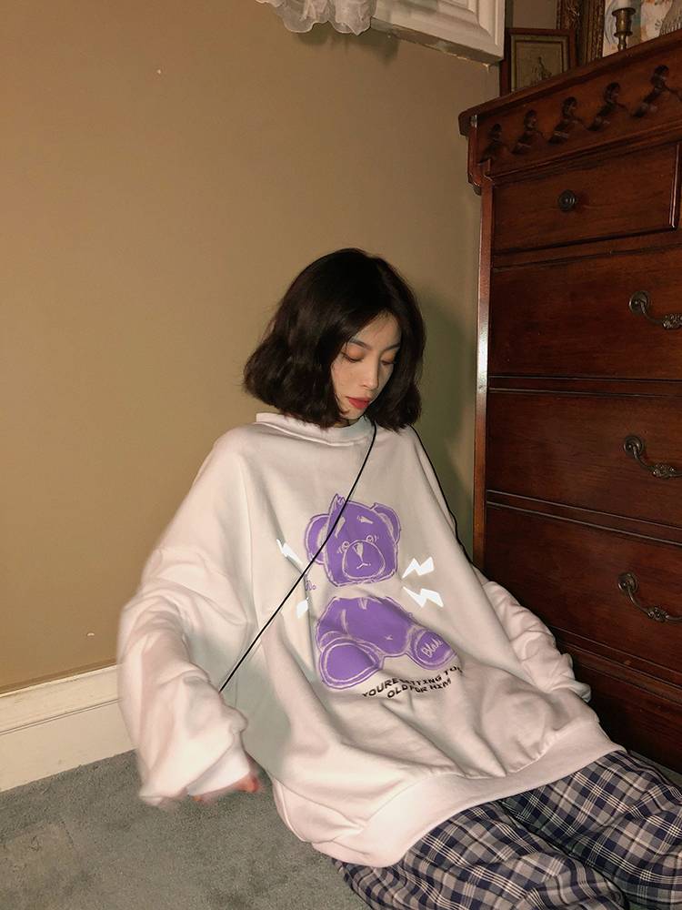 圆领加绒卫衣女2020秋新宽松韩版港味反光小熊印花外套潮