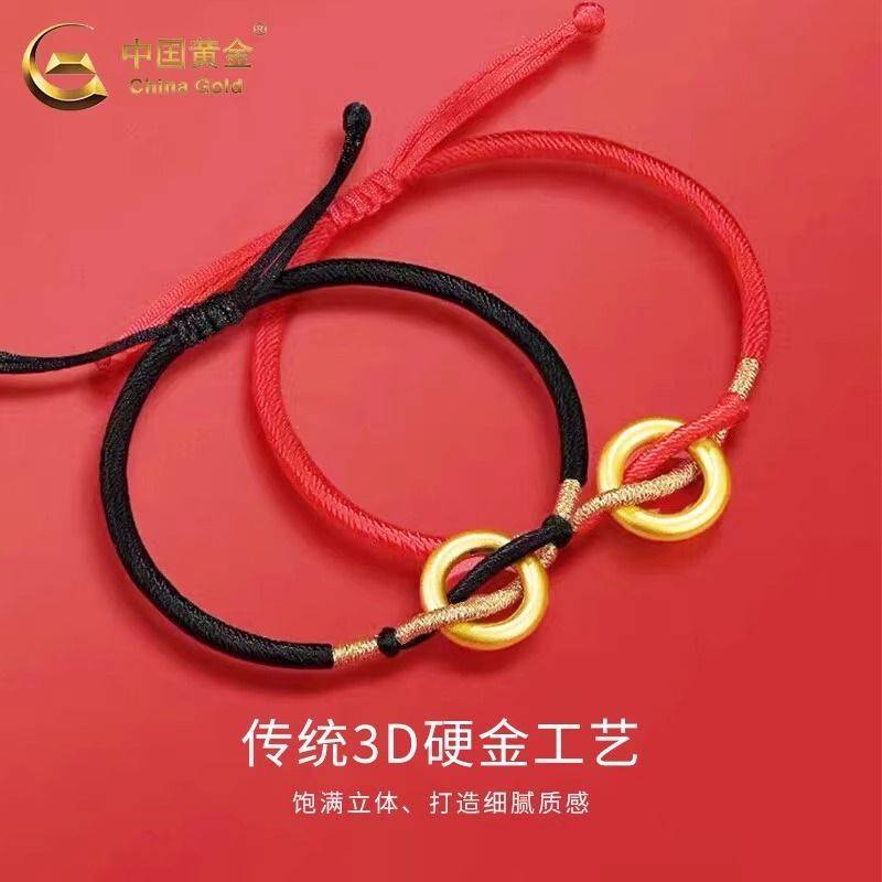 中国黄金平安扣手链男女红绳编织手绳999足金转运珠情侣款送女友
