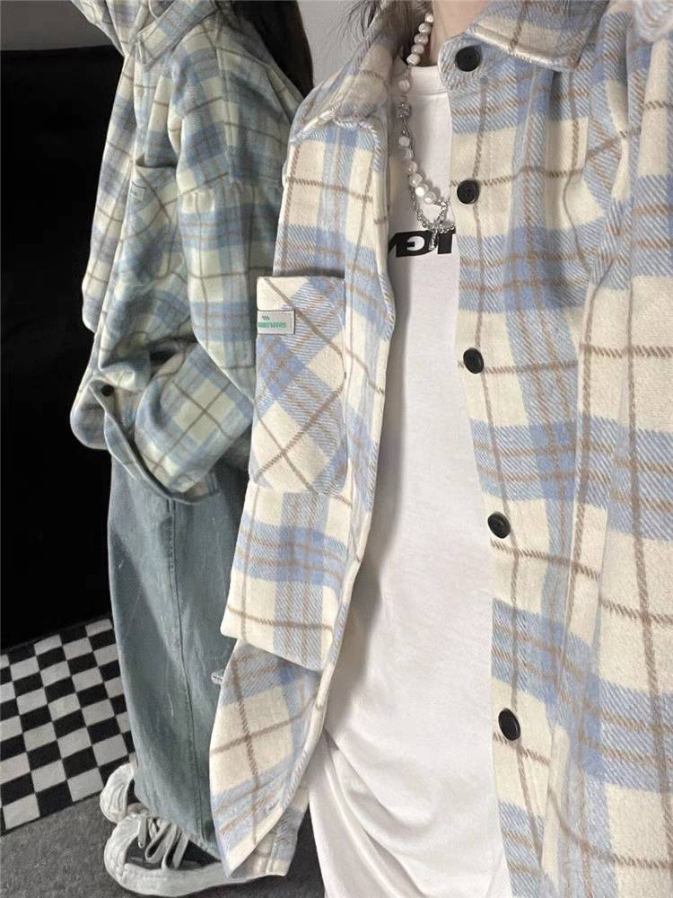 长袖格子衬衫外套春秋季复古设计感宽松衬衣上衣