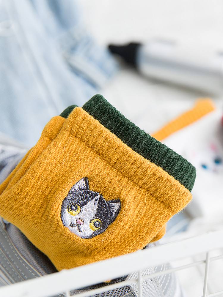 卡通刺绣纯棉袜纯棉吸汗不臭脚民族风复古配色卡通猫咪长袜