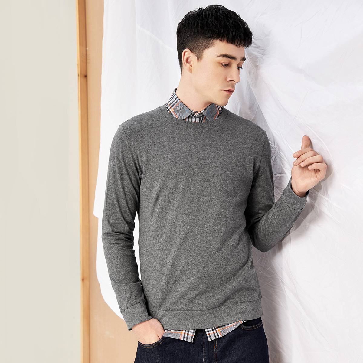 男装春季新款纯色休闲卫衣男 圆领套头长袖t恤男学生上衣
