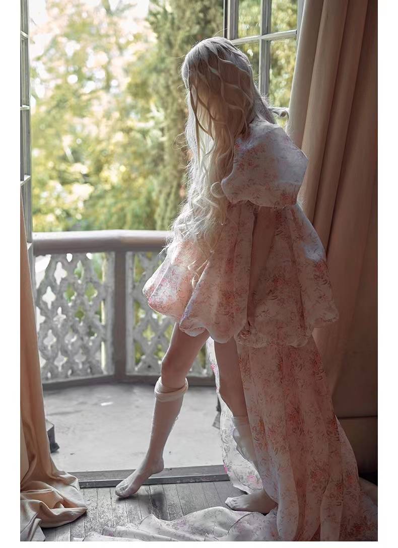 白底斑斓印花童话婚纱在逃公主礼服裙可收大拖尾