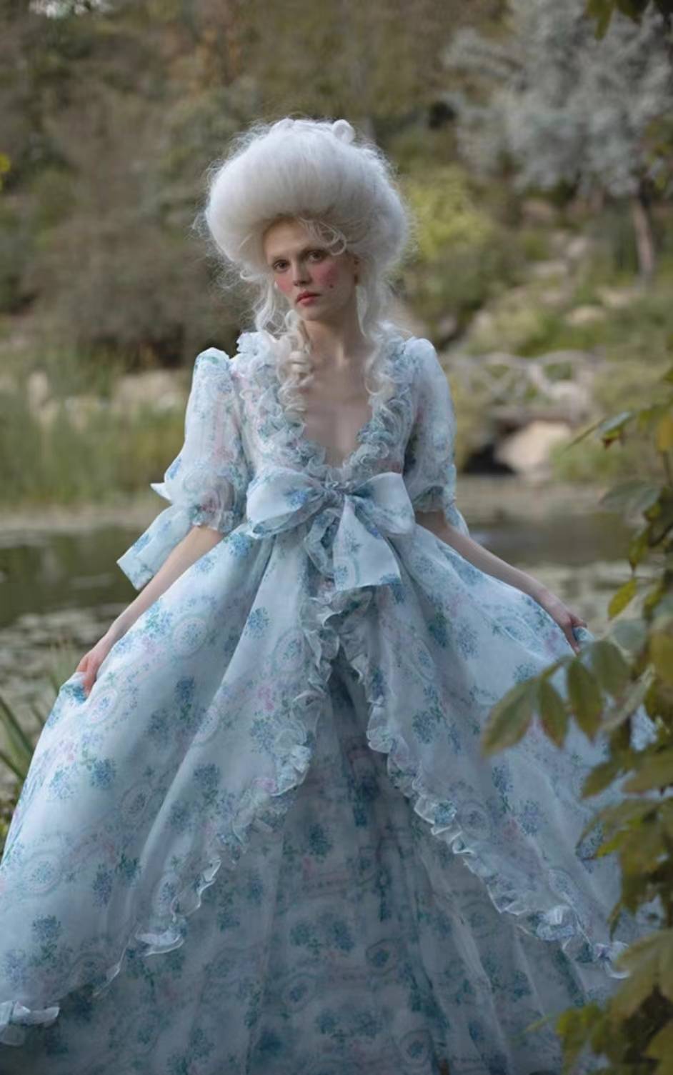 白底蓝色碎花印花在逃公主婚礼礼服裙