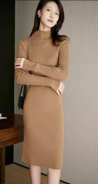 强推!优雅篙及气质 自然曲线美 纯羊毛竖坑条修身长款针织连衣裙