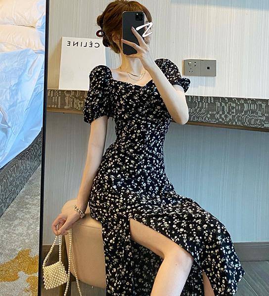茶歇法式雪纺赫本风方领碎花连衣裙2021新款春女夏天开叉显瘦长裙