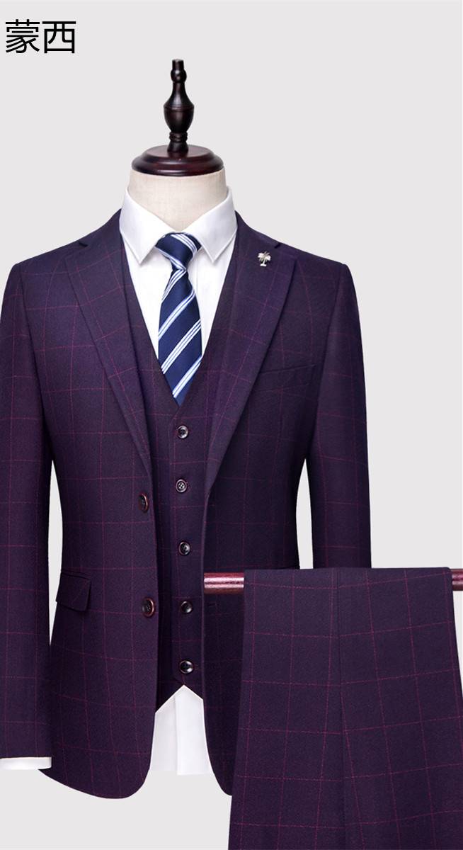 蒙西2020格子西服套装男士三件套韩版修身时尚西装新郎结婚西服