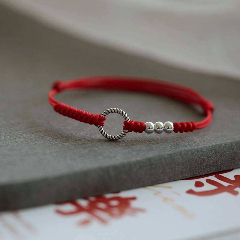 福字圆牌红绳手链S925纯银银珠红玛瑙简约女生手环本命年小众银饰