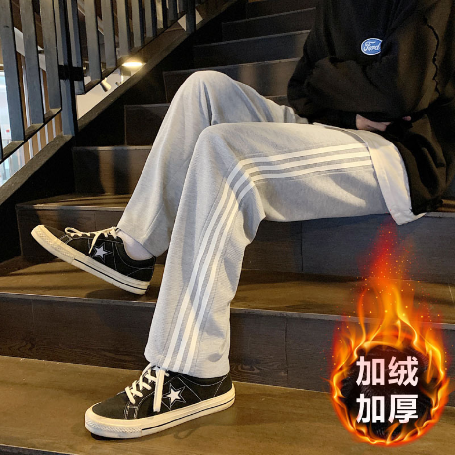 三条杠运动裤男秋冬加绒加厚直筒阔腿裤子宽松潮流百搭九分休闲裤