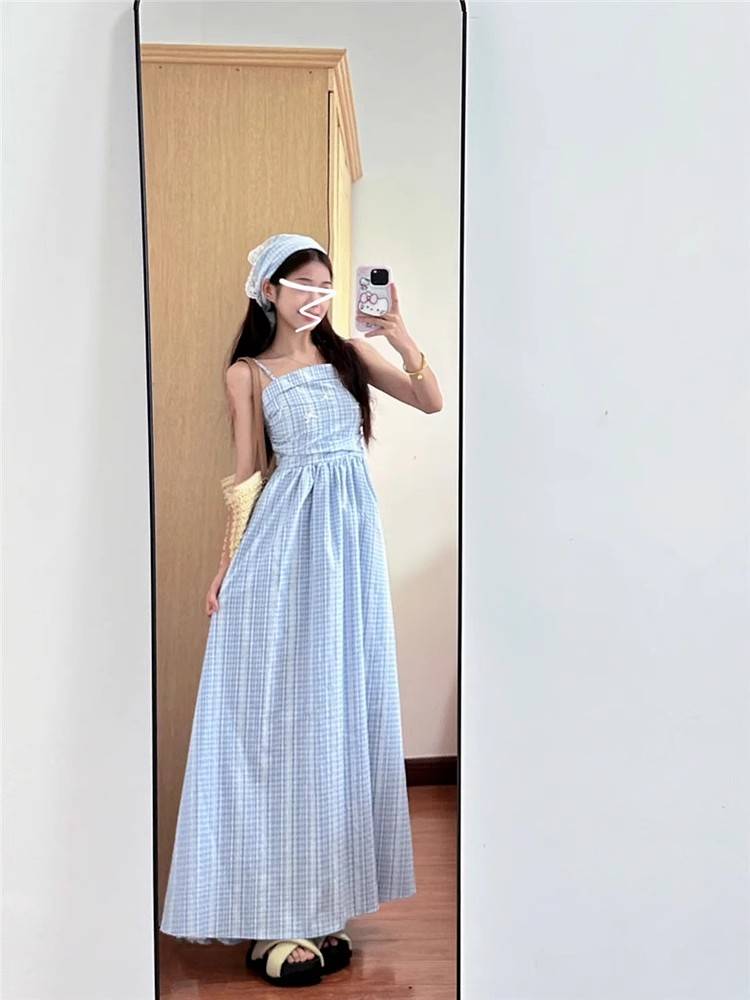 法式蓝色格子吊带连衣裙子女夏季2024新款小个子海边度假气质长裙