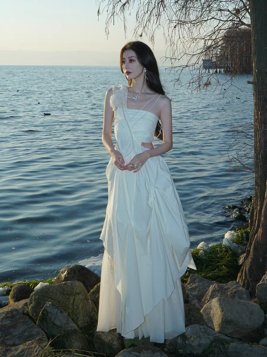 桑晚 秋季新款米白花朵背带仙女连衣裙 2024小众设计款气质长裙