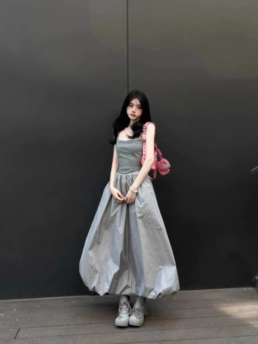桑晚 吊带背心连衣裙子女装2024秋季新款气质收腰花苞长裙纯色a字裙