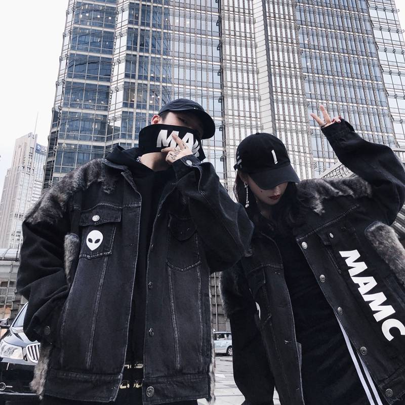 A神不在纽约 潮牌外星人拼毛飘带情侣水洗黑牛仔夹克厚外套MAMC