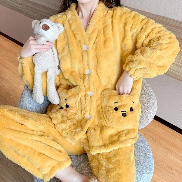 珊瑚绒睡衣女秋冬加厚长袖套装韩版V领开扣麻花绒家居服网红爆款