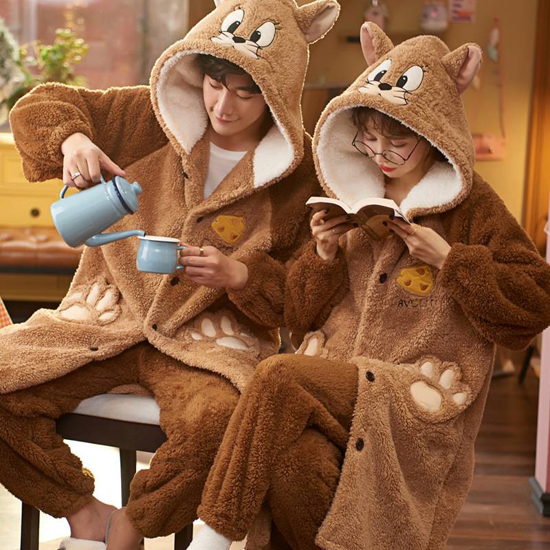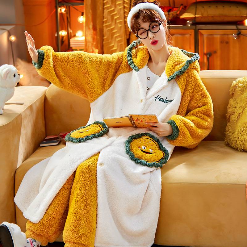 马兰花开冬季加厚法兰绒女士睡衣套装保暖珊瑚绒女式睡袍甜
