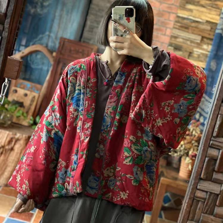 2021秋冬落古泥国风汉服无扣半开袖宽松短棉衣棉外披红大花