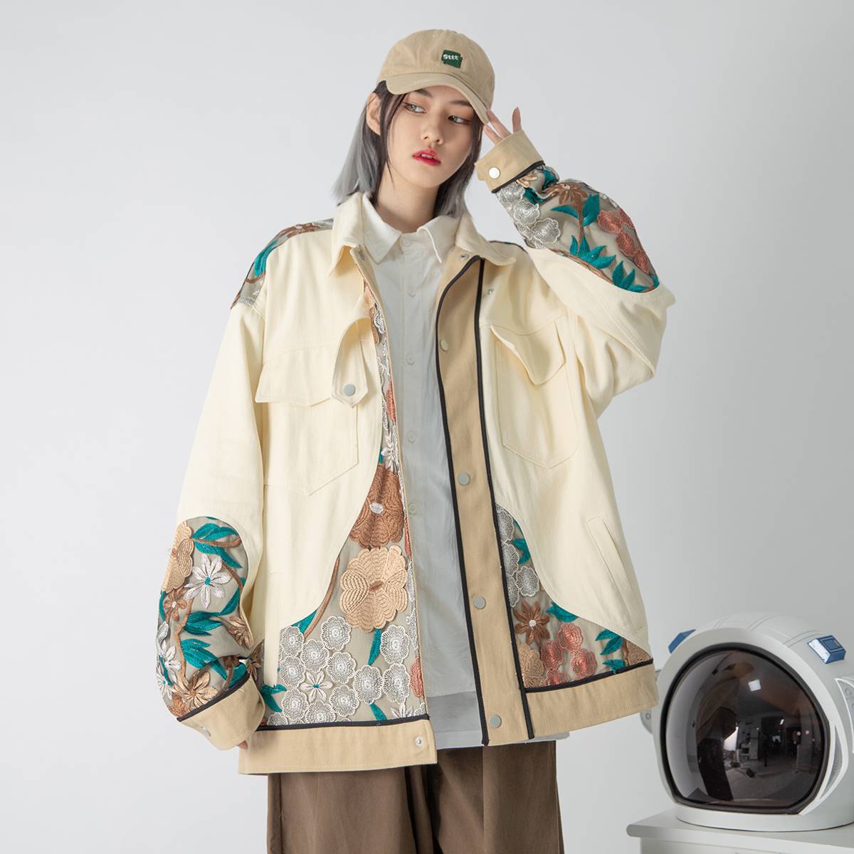 外套女蕾丝oversize棒球服国潮小香风工装夹克