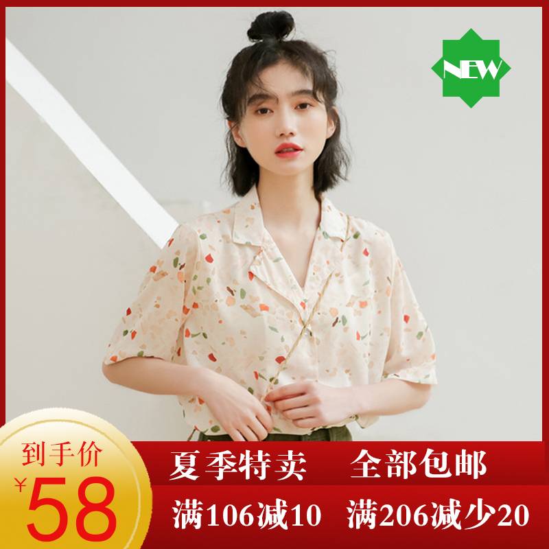 2020夏季韩版简约chic复古港风少女西装领口印花雪纺短袖衬衫女潮