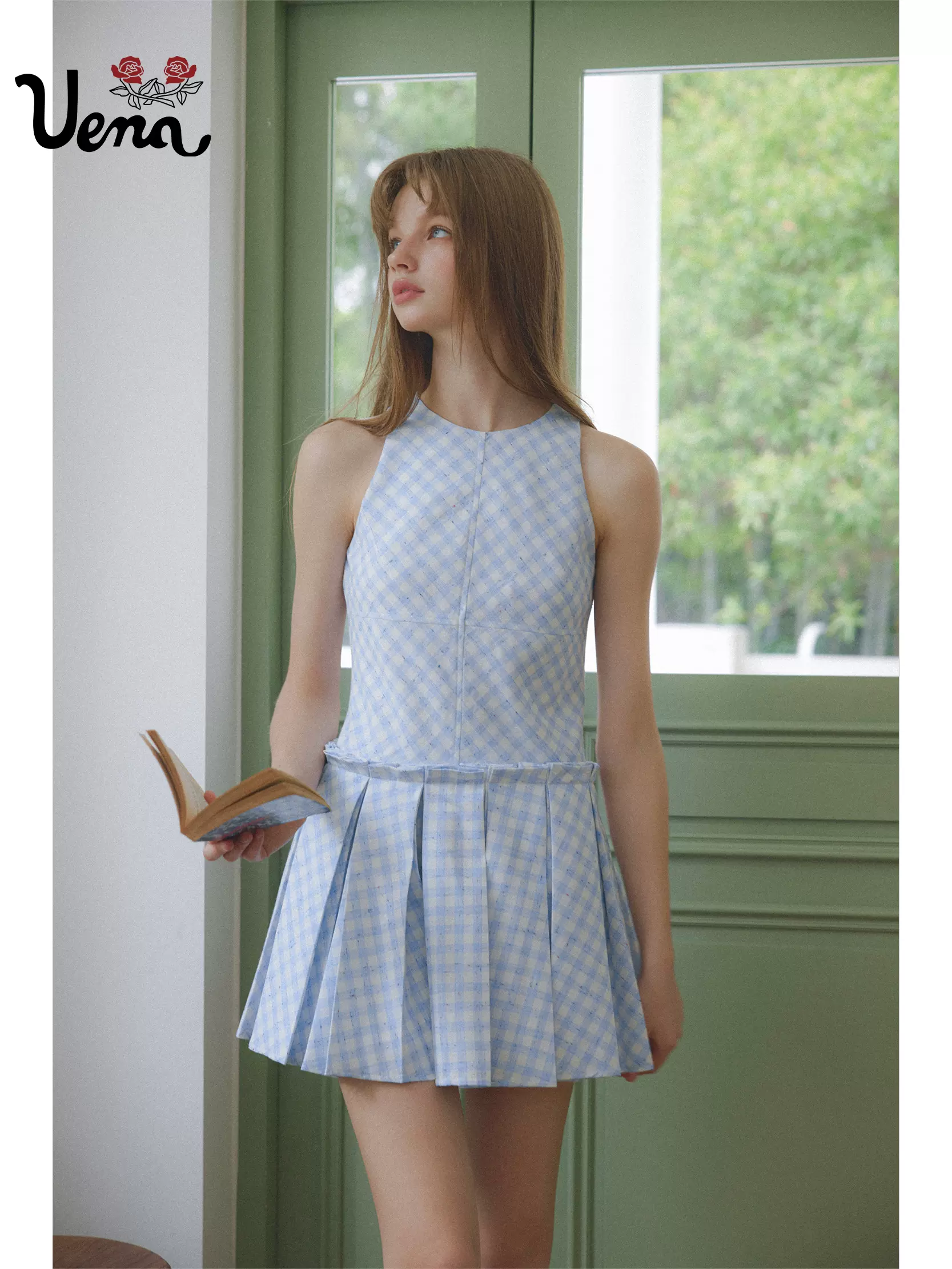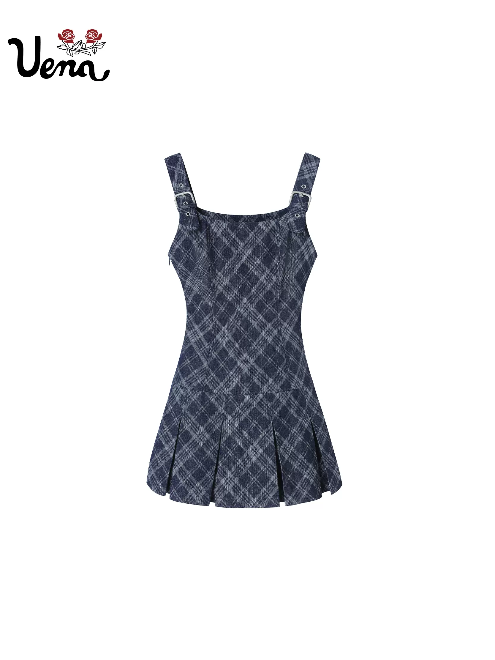 【椰林长风】美式复古蓝色格纹A字收腰百褶下摆背心连衣裙女