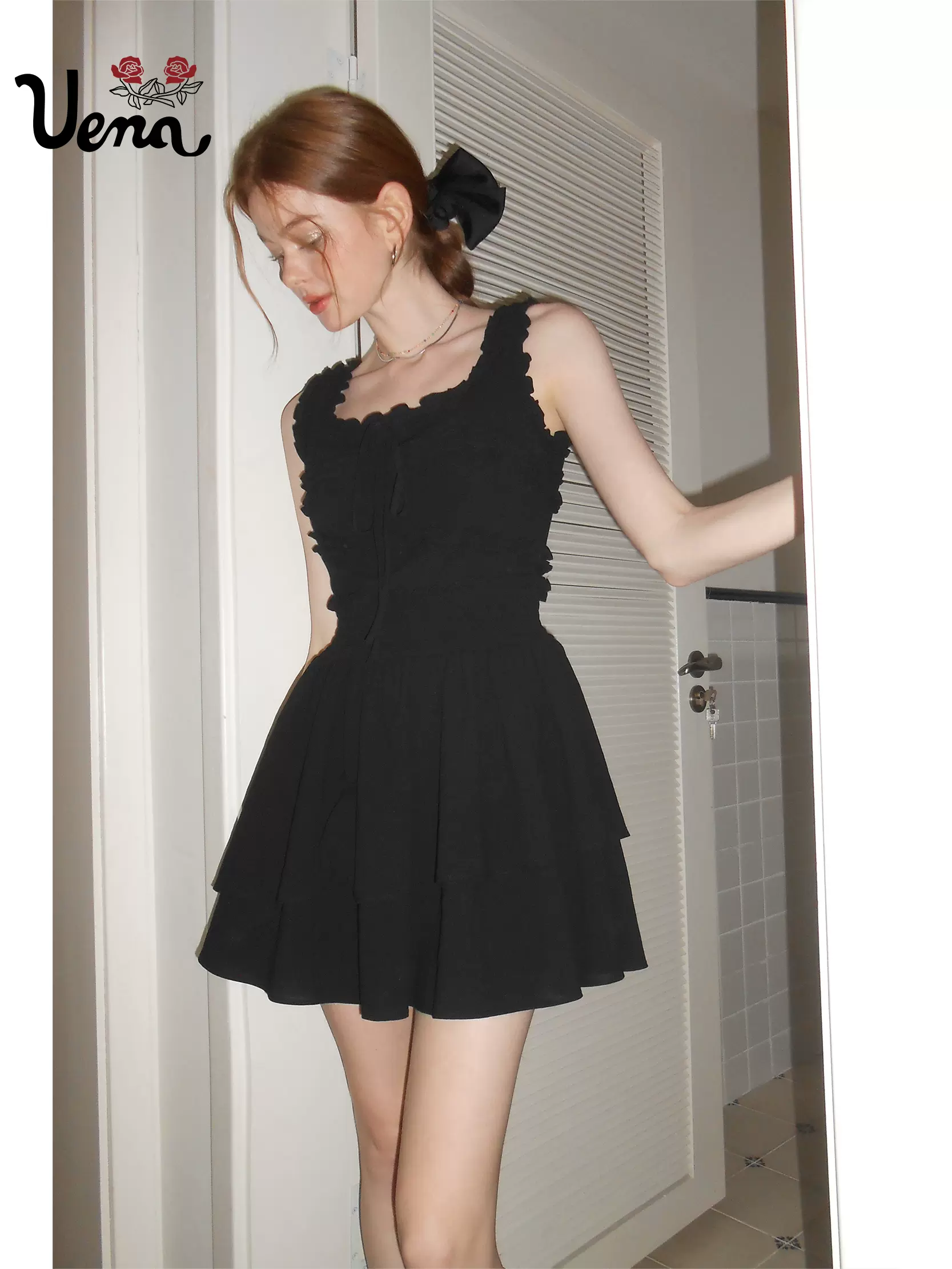 【月影山茶】美式复古黑色荷叶边U型领抽皱无袖A字背心连衣裙