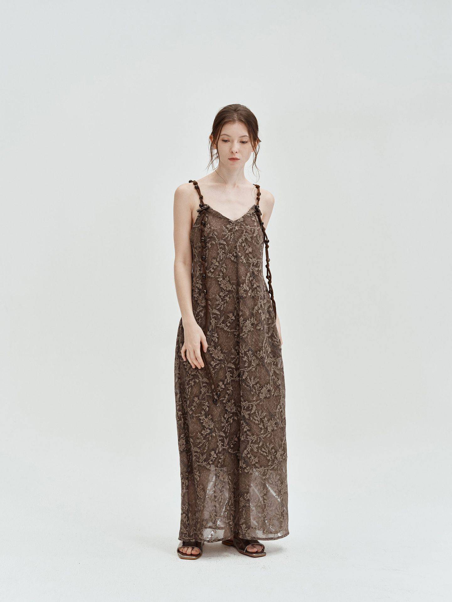 新中式珠子编绳连衣裙女早春复古感显瘦透 视吊带裙子