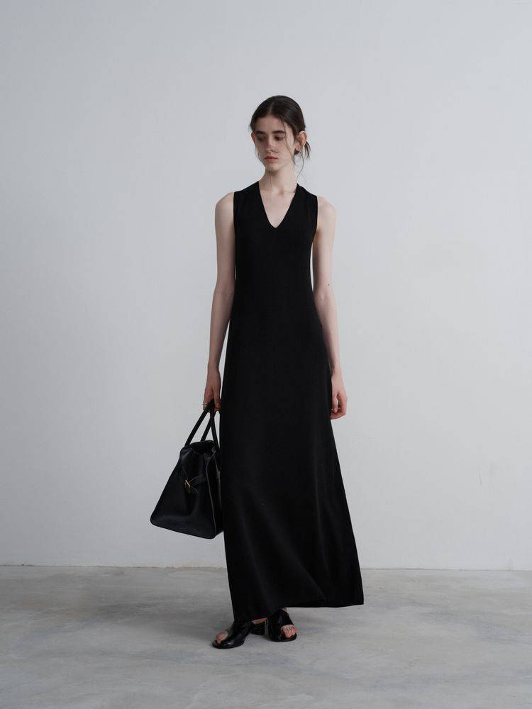 法式V领扭结吊带毛织连衣裙女装春季简 约通勤长裙子