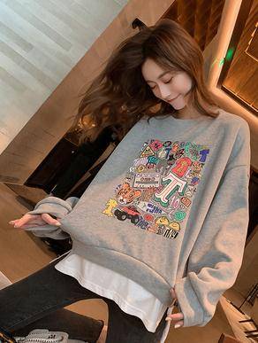 小个子2019新款短款加绒女假两件拼接宽松套头印花卫衣潮