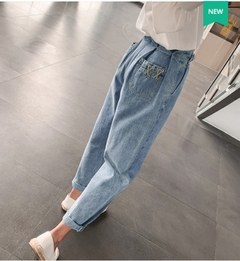小谷粒新款chic直筒牛仔裤女宽松韩版腰部收褶显瘦百搭哈伦裤潮