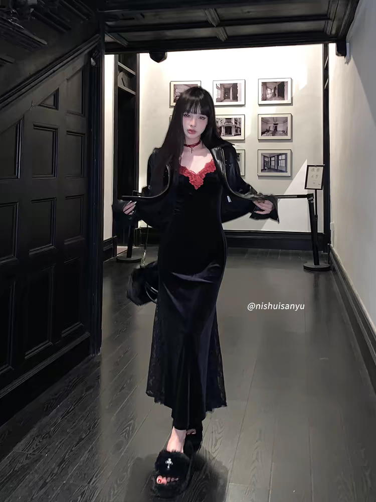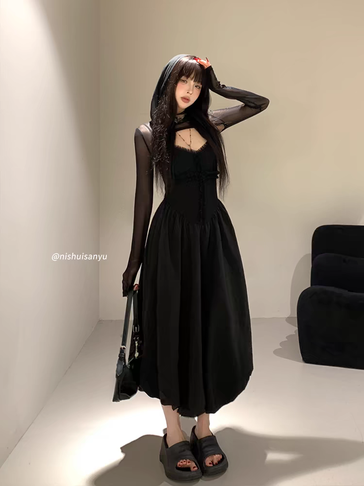 万圣节黑色花苞连衣裙女深秋初冬法式小黑裙针织吊带长裙