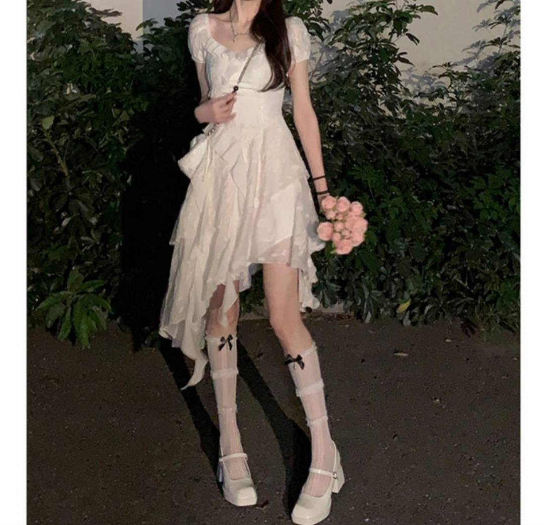 Cuties温柔荷叶边不规则显腰细白色连衣裙仙女裙
