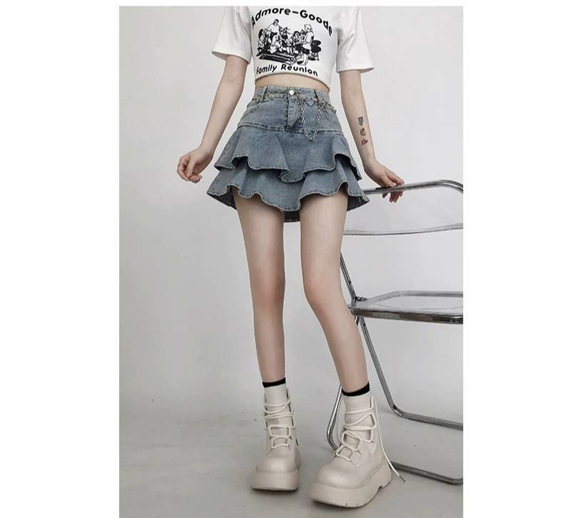 Cuties高腰辣妹甜妹小个子荷叶边半身牛仔蛋糕裙