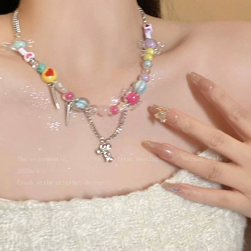 糖果甜心彩色蝴蝶结流苏项链小众设计配饰甜酷辣妹锁骨链手链