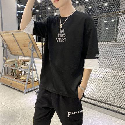 七分袖t恤男日系宽松嘻哈7分袖短袖丅恤韩版个性潮流夏季衣服潮牌