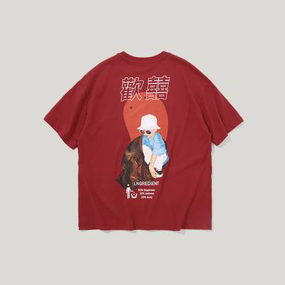 夏季新款国潮牌情侣款欢喜文字小孩印花男士短袖T恤嘻哈