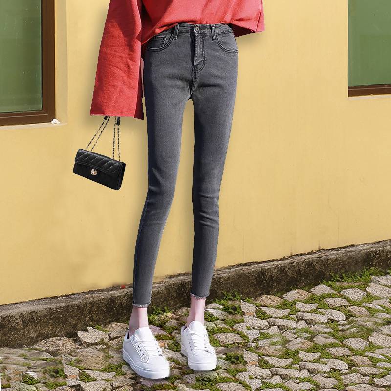 韩版2019新款潮高腰牛仔裤女显瘦直筒毛边小脚九分春夏薄款铅笔