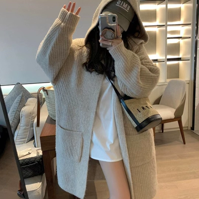 秋冬新款大码女装慵懒连帽宽松加厚中长款大开衫外套加长毛衣女