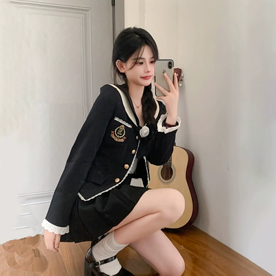 实拍美术系学姐学院风减龄洋气蝴蝶结外套高腰百褶裙两件套