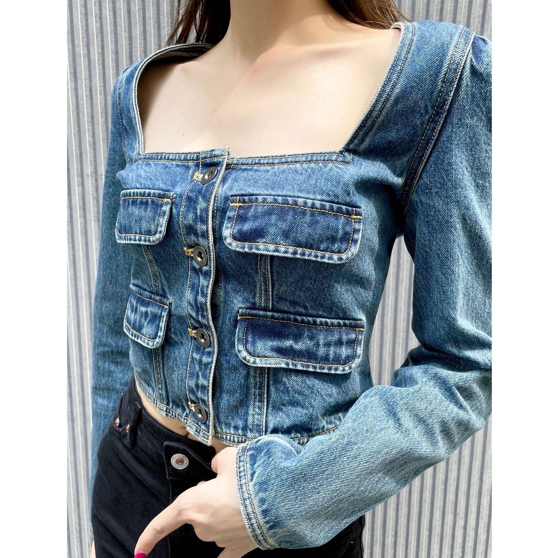 春夏新款气质方领口袋装饰修身短上衣牛仔外套女