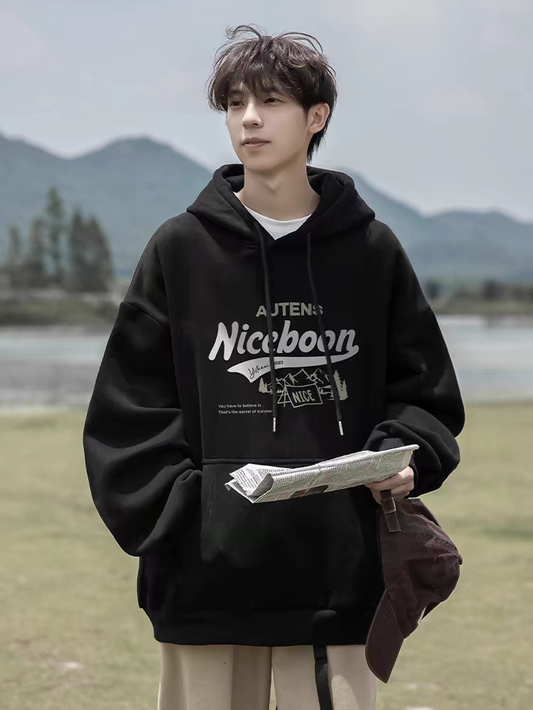 美式复古连帽卫衣男士春秋季2025新款美式潮牌连帽衫重磅黑色外套