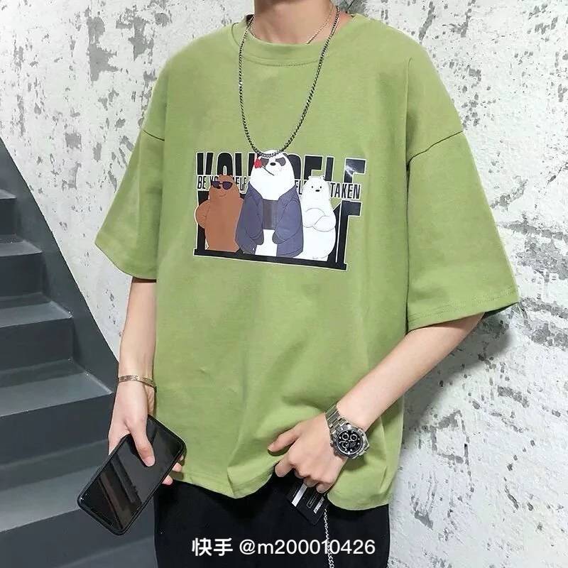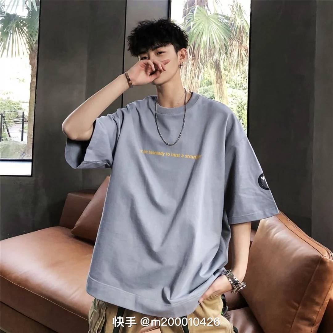 美式街头复古小领口短袖T恤男字母印花圆领宽松百搭休闲个性上衣