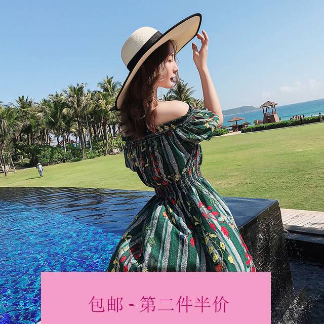 2019夏季新款一字肩连衣裙女超长款到脚踝超仙女格子大摆度假长裙