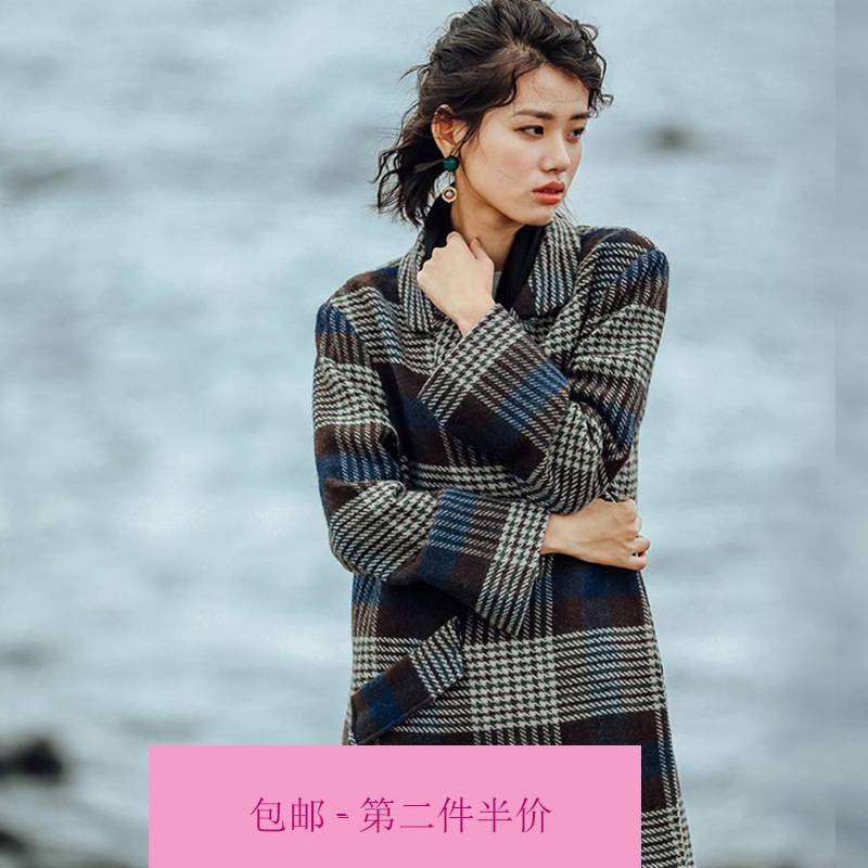 7099冬季新款女装设计师品牌复古兰格子长款毛呢外套大码羊毛大衣