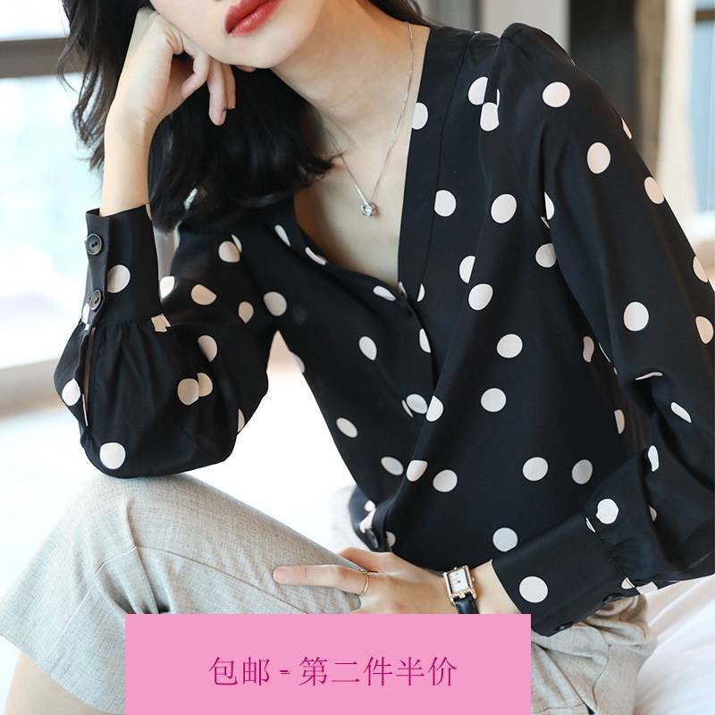 真丝波点衬衫女2019春季新款长袖V领衬衣宽松百搭桑蚕丝上衣S0926