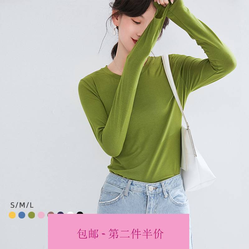 基础款百搭牛油果绿打底衫t恤女初秋韩版chic圆领套头长袖T恤