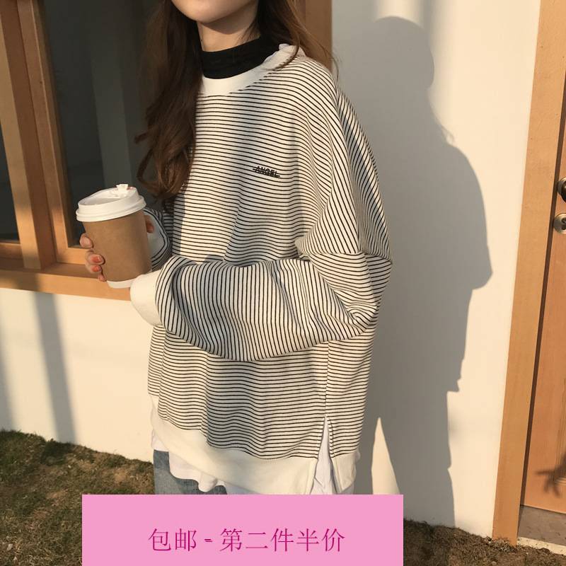 3039#假两件条纹卫衣女秋季韩版宽松百搭上衣长袖套头ins超火外套