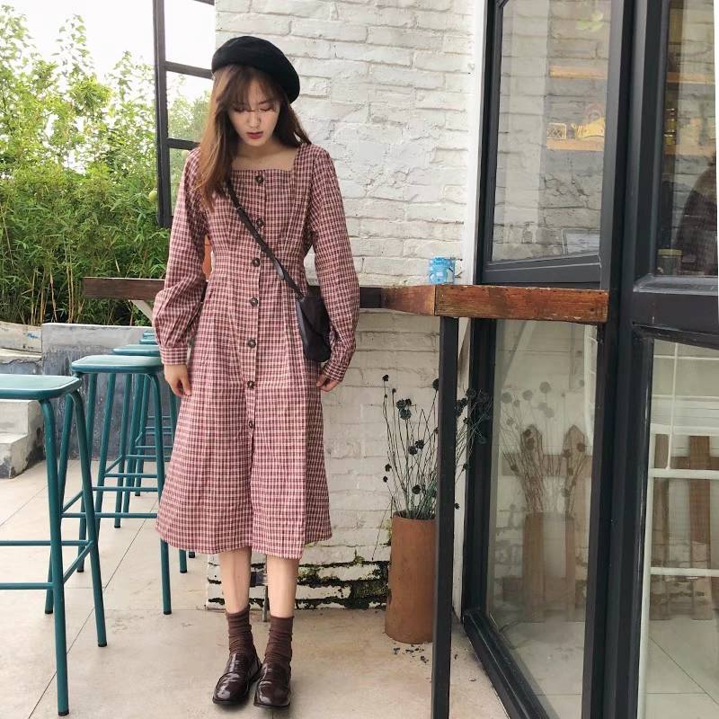 2019新款春复古格子连衣裙系带方领高腰一排扣中长款裙子