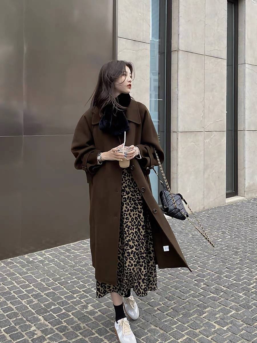 咖啡色毛呢外套女2020冬季新款中长款手工双面呢大衣