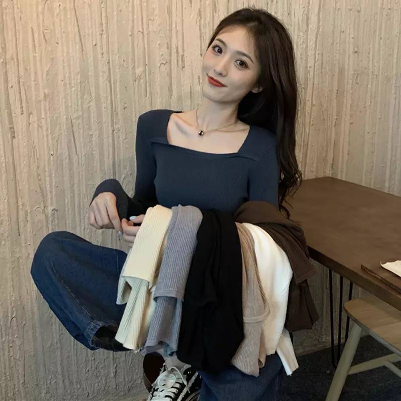 针织打底衫女秋冬新款方领修身内搭长袖紧身毛衣上衣