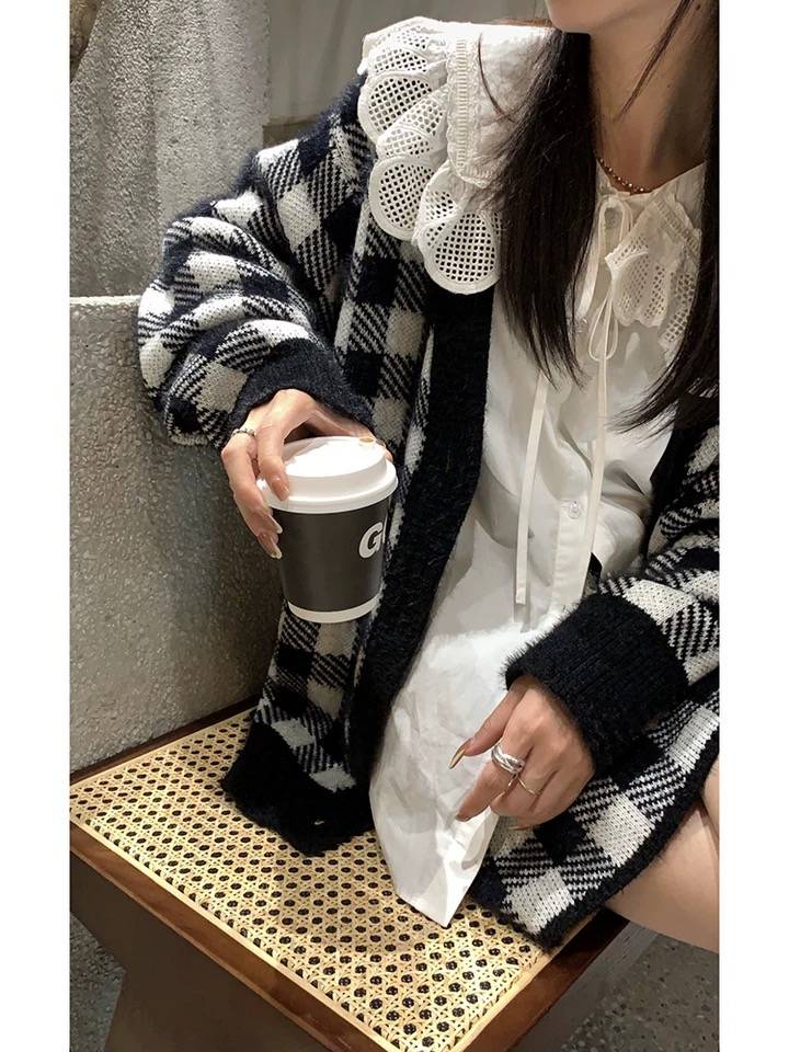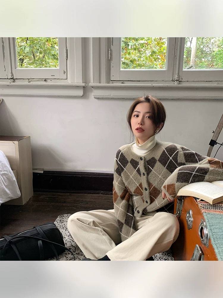 【伦敦学院】2020秋冬新款外套宽松菱格复古毛针织开衫